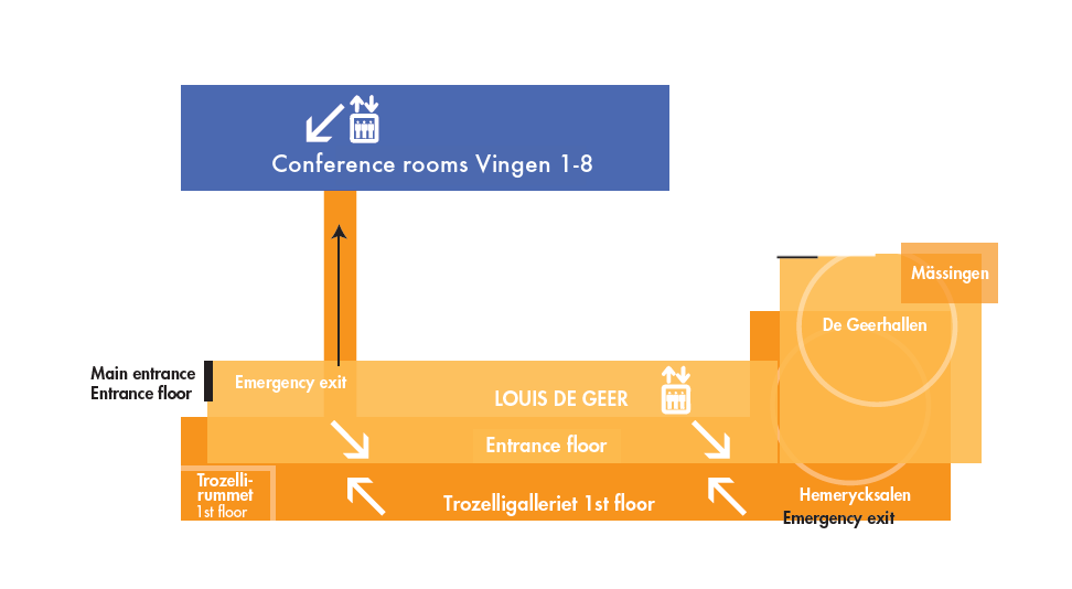 The welcome reception on Monday will happen in floor 0 and the outside area next to the Louis de Geer hall. The conference dinner takes place in Värmekyrkan next to the conference venue.
